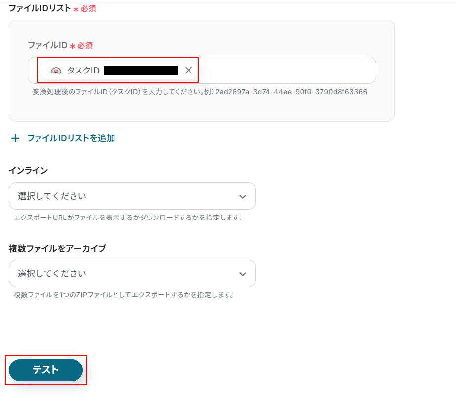 ファイルIDリストには、デフォルトでタスクIDが設定されているため、そのまま使用します。今回は、インライン、複数ファイルをアーカイブのどちらも使用しないため、設定しません。 使用したい場合は、注釈をご確認ください。