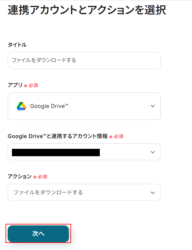 「Google Driveと連携するアカウント情報」が任意のものに設定されていることを確認したら、「次へ」をクリックします。