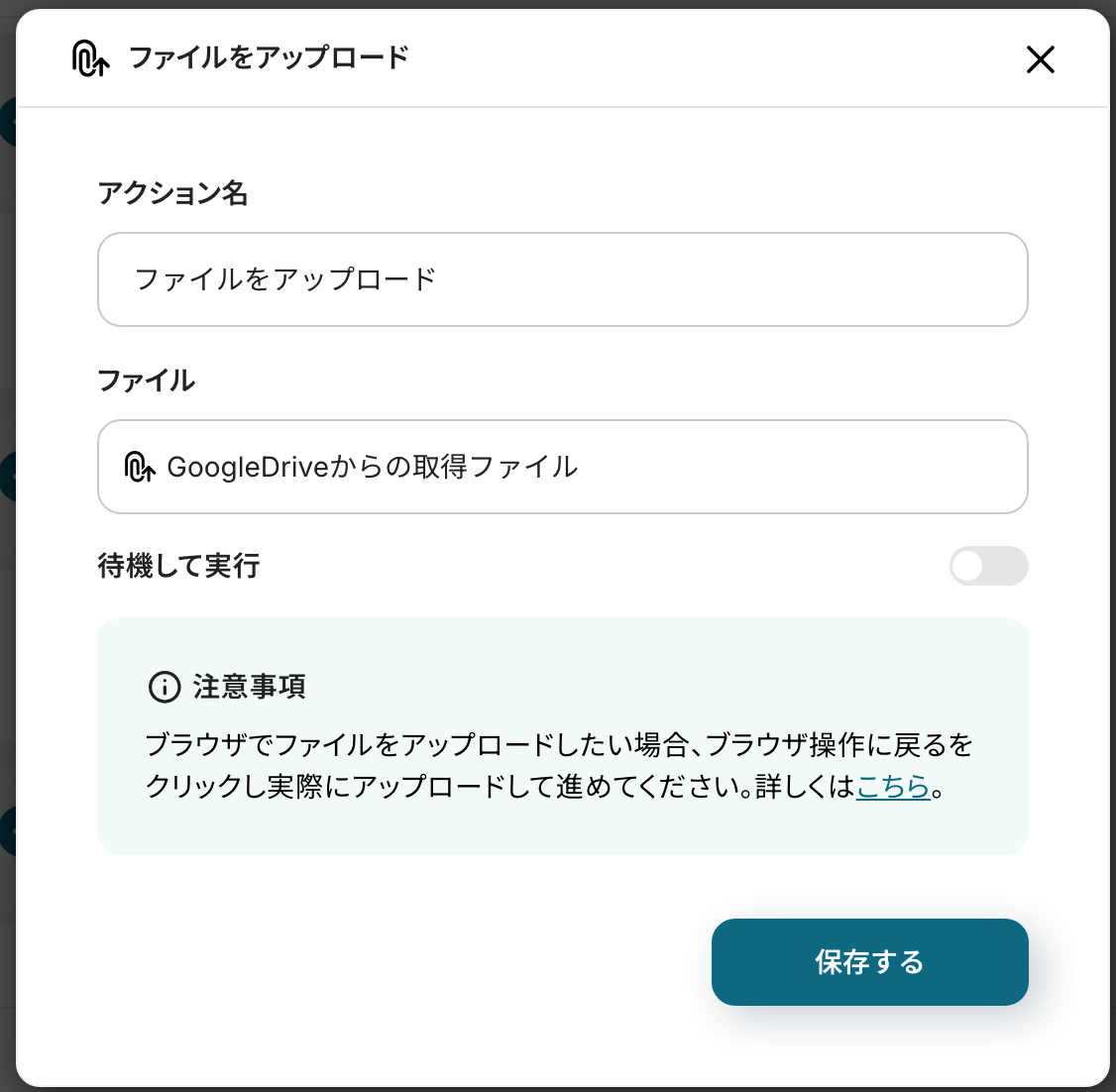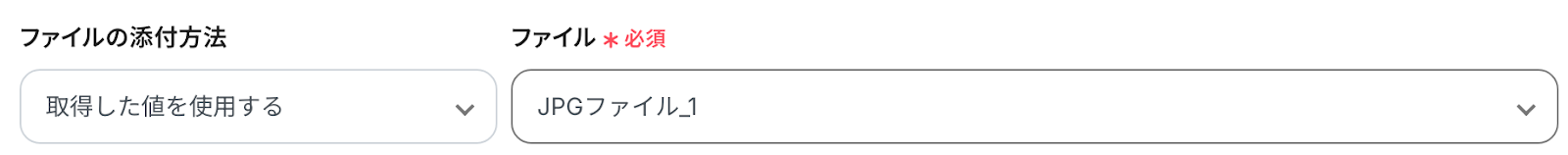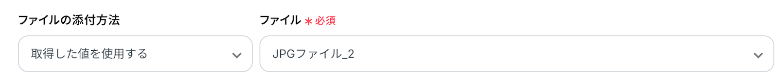 「2.ファイルをアップロード」では、デフォルトで、前段階で取得した添付ファイルが設定されています。こちらも特段変更は不要です。