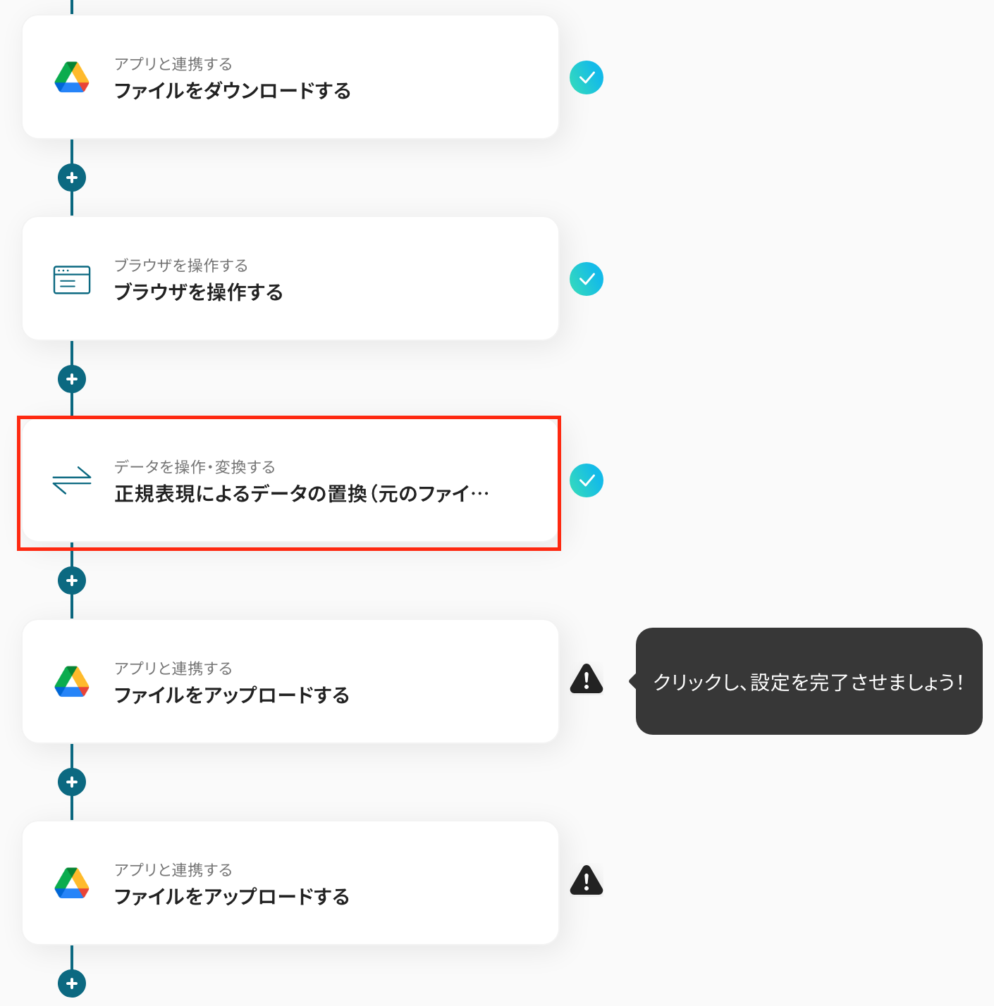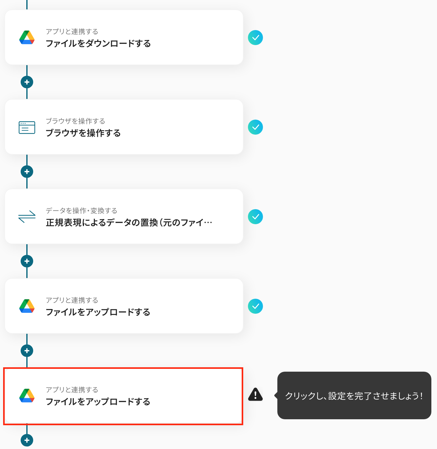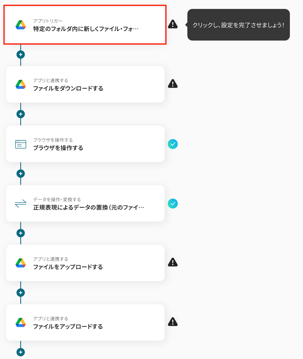 以上で、「Google DriveにZIPファイルがアップロードされたら、オンラインツールでJPGに変換して別フォルダに保存する」フローの完成です。お疲れ様でした。