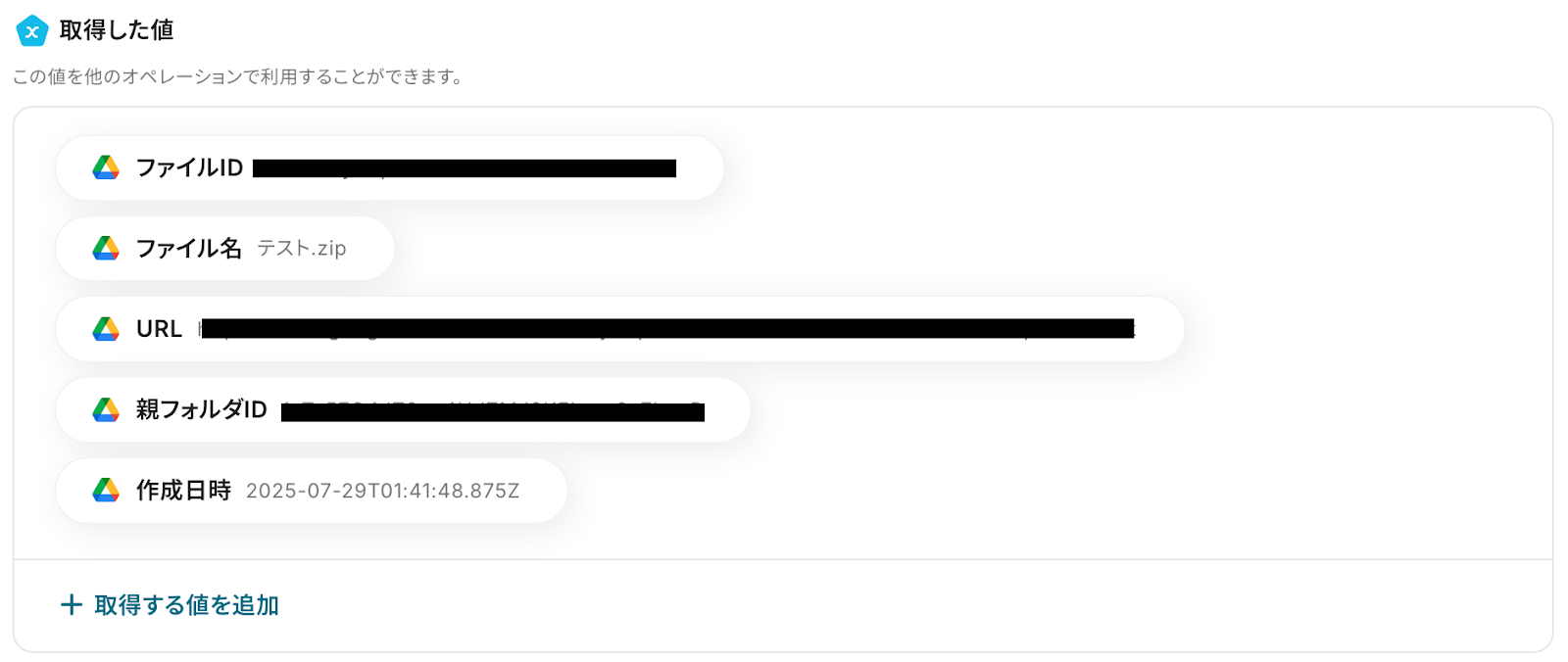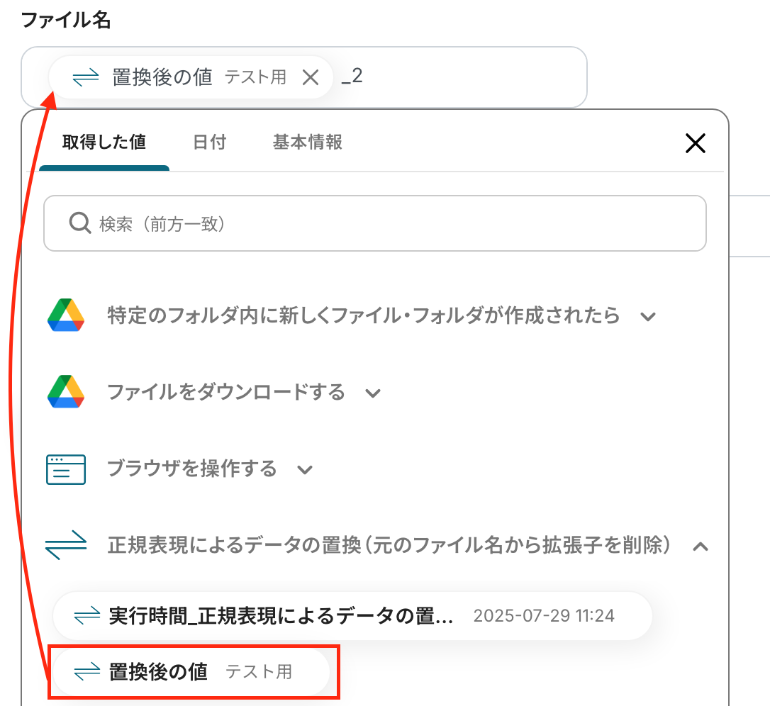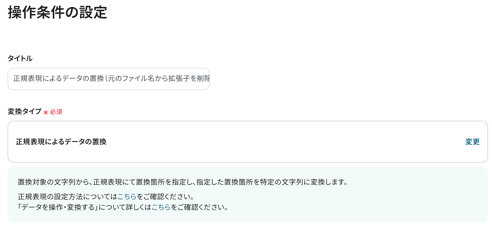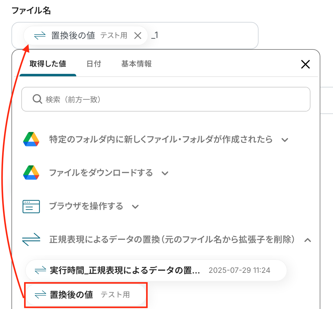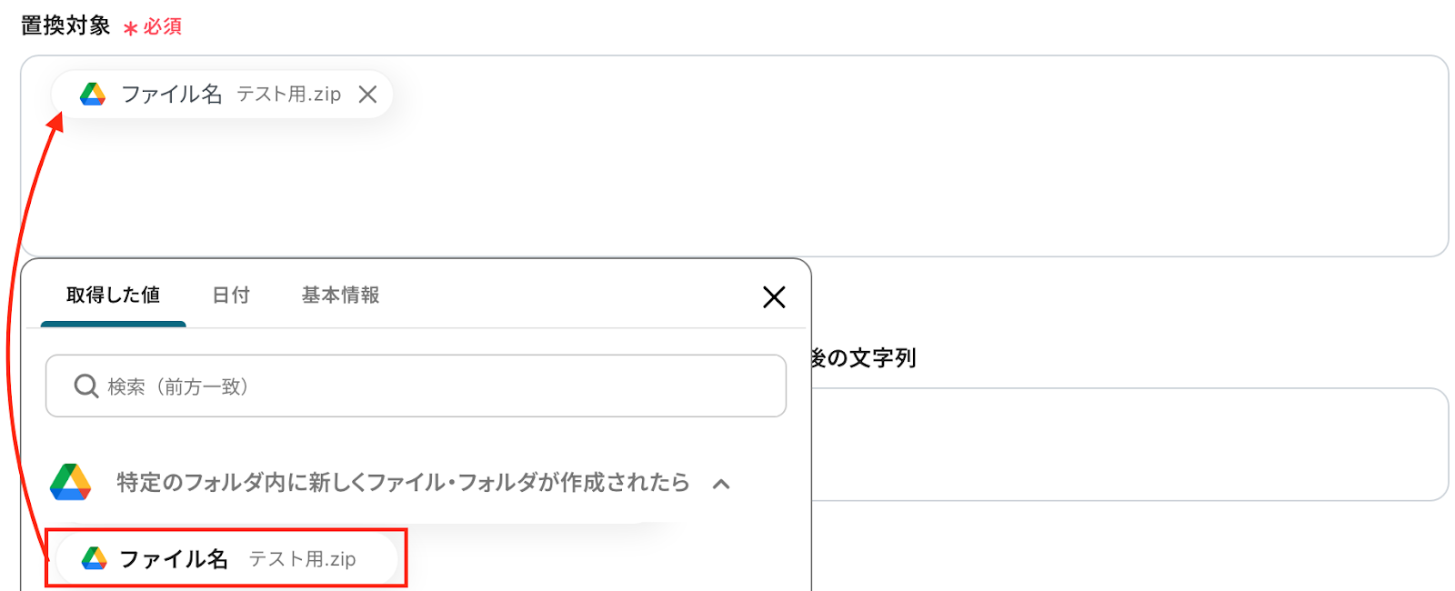 ここでは、Google Driveのトリガー設定で取得したZIPファイルの「ファイル名」から拡張子を削除するために設定を行います。