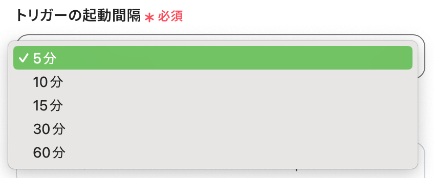 ・トリガーは5分、10分、15分、30分、60分の間隔で起動間隔を選択できます。