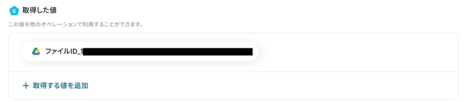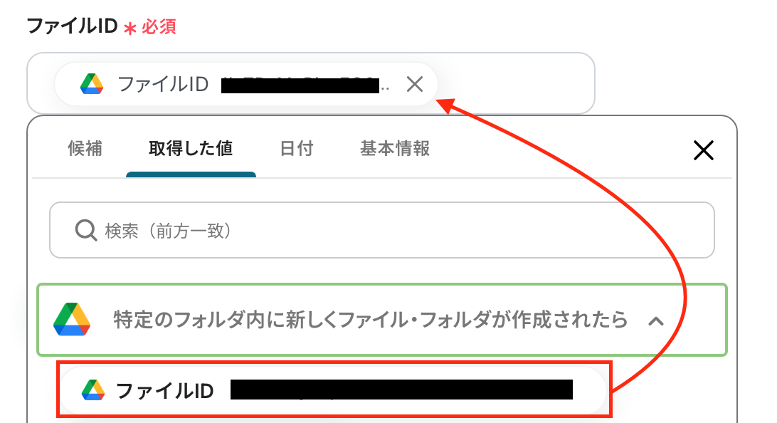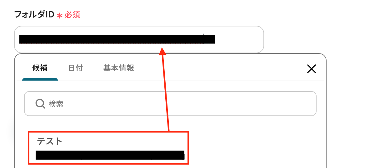 格納先のファイルID:入力欄をクリックして表示される「候補」から引用して設定します。