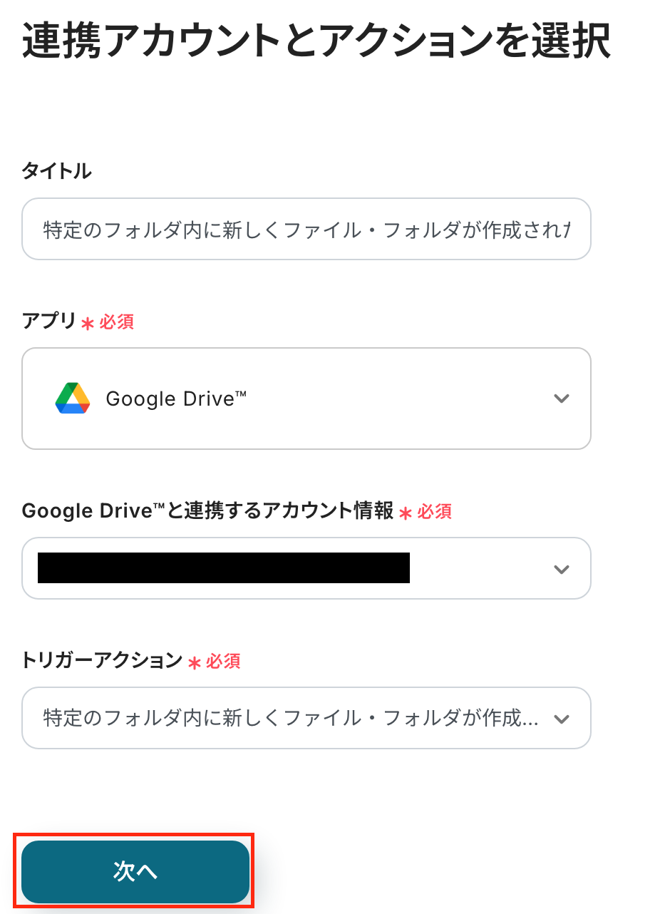タイトルと連携するアカウント情報を確認し、アクションはテンプレート通りのまま「次へ」をクリックして進んでください。