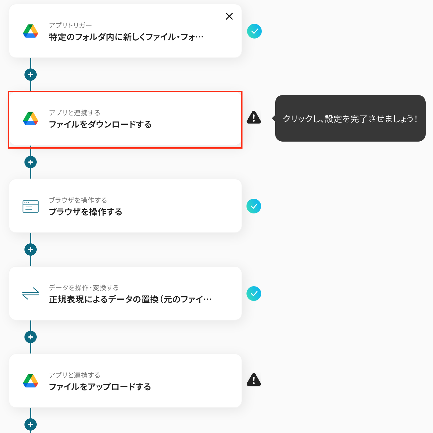 ここでは、Google Driveに保存されているファイルをダウンロードする設定を行います。