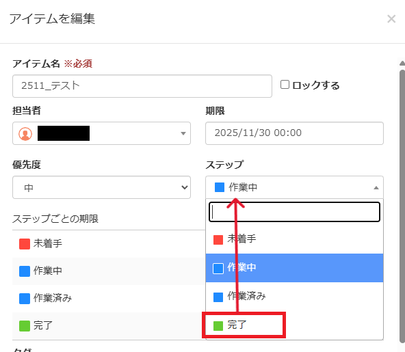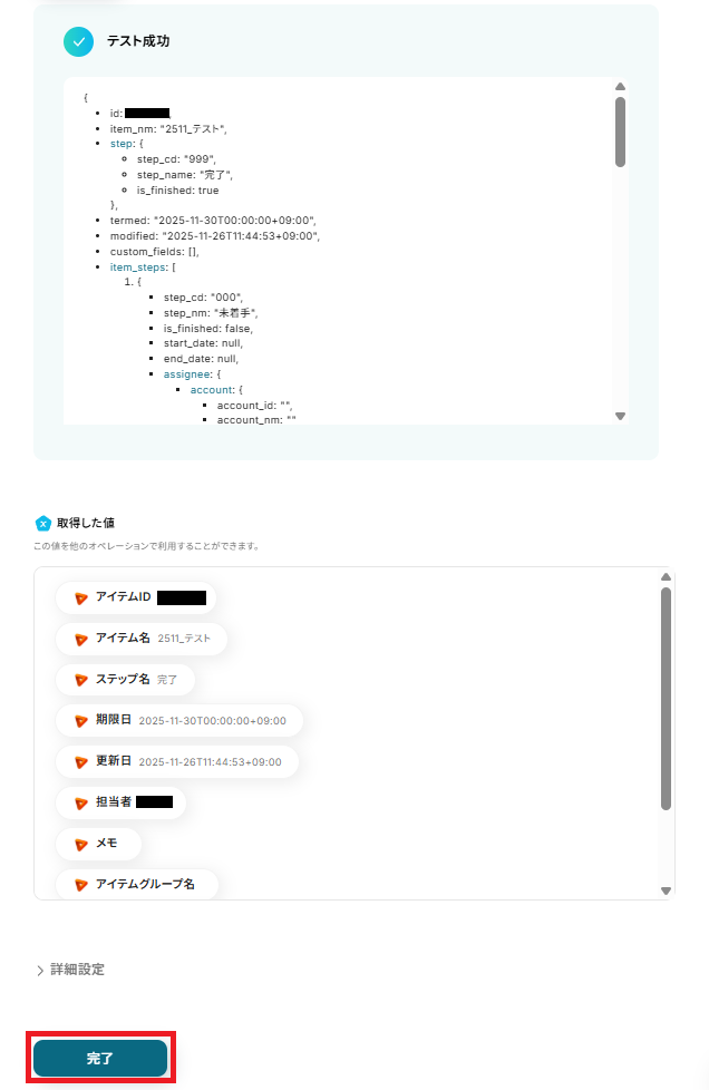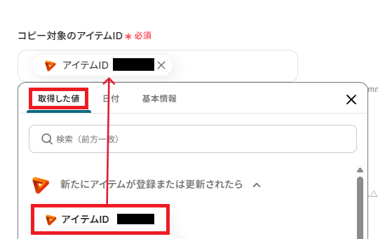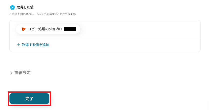 「コピー対象のアイテムID」は、取得した値から完了に変更したアイテムIDを選択しましょう。