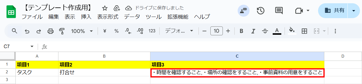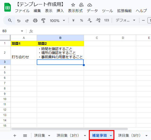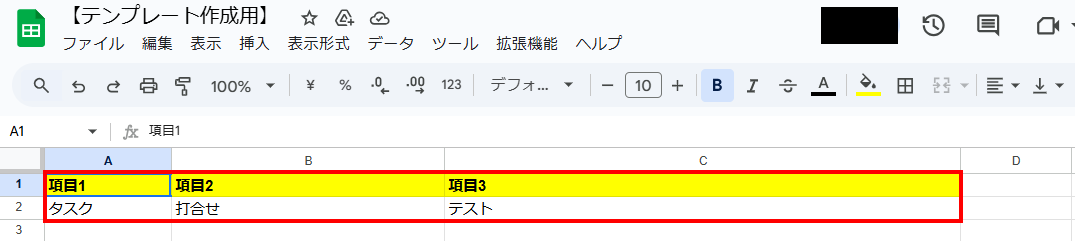 3.ここでは、トリガーとなるGoogle スプレッドシートの具体的な設定をしていきましょう。 まだ、Google スプレッドシートの準備が出来ていない場合は、このタイミングで作成してください。 今回は、下記のようなGoogle スプレッドシートを作成したので、こちらのGoogle スプレッドシートをトリガーとして設定していきたいと思います! また、Google スプレッドシートを作成する際は、項目だけでなく下記赤枠のように項目の内容も入力しましょう。 項目内容も入力することで、この後のテスト操作がスムーズに行えます!