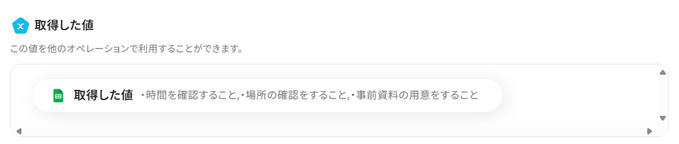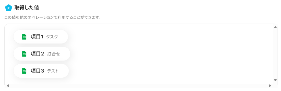 入力が完了したら、「テスト」を実行してみましょう。 テストが成功すると、下記のようなアウトプットが表示されます。 Google スプレッドシートの内容が反映していればOKです! 最後に、「保存する」を押して次のステップへ進みましょう。