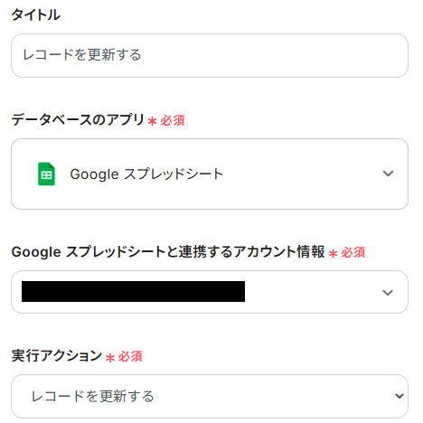 2.画面が遷移するので、ここでは更新するGoogle スプレッドシートを具体的に指定する設定を行います。 まず、タイトルとアカウント情報はステップ1で設定した内容が入力されているので、そのままで大丈夫です。タイトルはわかりやすいものに修正可能ですので、お好みで変更してください。 実行アクションは、テンプレート通りに「レコードを更新する」のままでOKです。