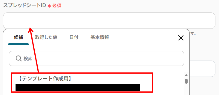 スプレッドシートID:入力欄をクリックすると、下図のような候補が表示されます。対象のGoogle スプレッドシートを選択してください。