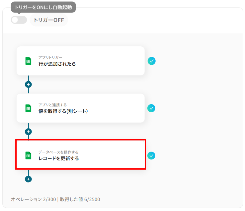1.次は、元のGoogle スプレッドシートのレコードを更新する設定をします。 まずは、以下の赤枠をクリックしてください。