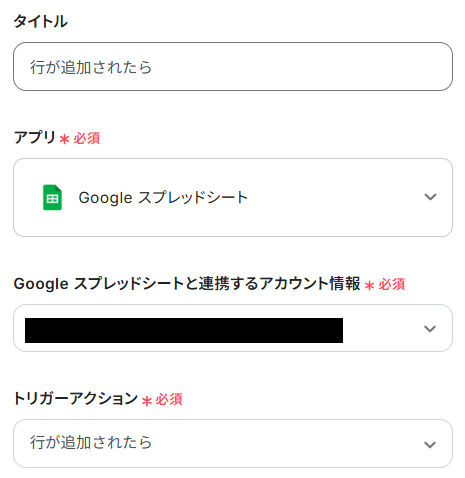2.画面が遷移するので、連携アカウントとアクションを設定しましょう。 タイトルとアカウント情報はステップ1で設定した内容が反映されており、タイトルは分かりやすいものに修正可能です。 トリガーアクションは、テンプレート通りに「行が追加されたら」のままで大丈夫です。 「次へ」をクリックして進んでください。