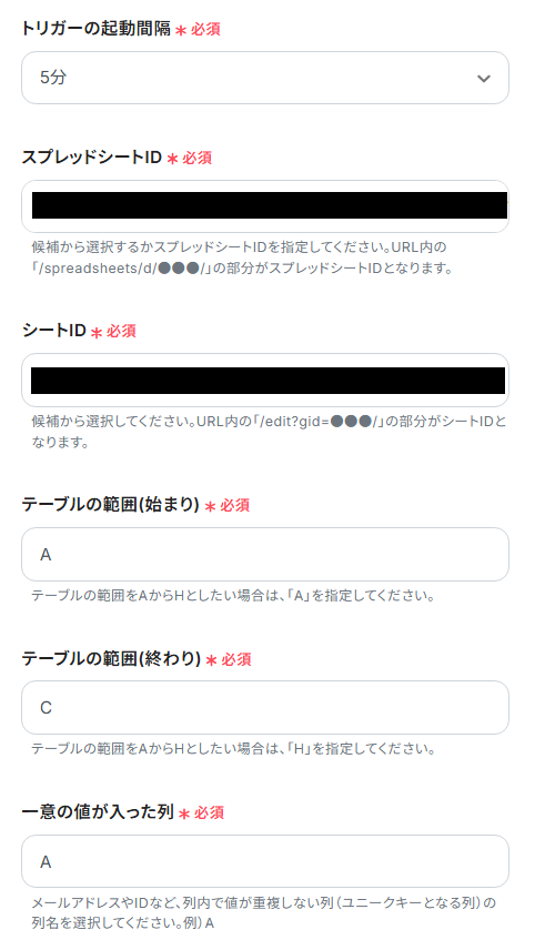 一意の値が入った列:入力欄下の注釈を参考に、重複しない列を入力してください。