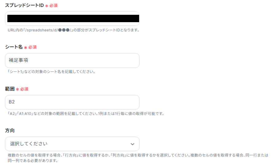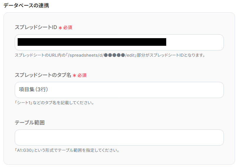 テーブルの範囲(始まり)、テーブルの範囲(終わり):Google スプレッドシートの対象となる範囲を英字で設定してください。