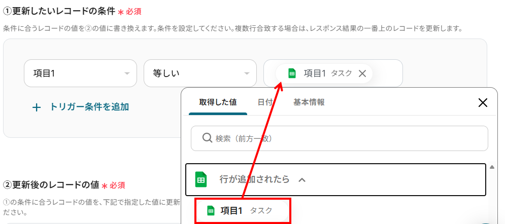 次に、「更新後のレコードの値」を設定しましょう。 こちらも、入力欄をクリックすることでアウトプットが表示されるので、更新したいレコードの値を入力してください。