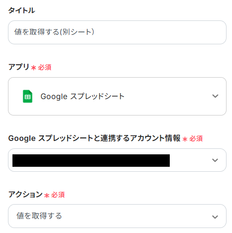 2.画面が遷移するので、連携アカウントとアクションの設定をします。 タイトルとアカウント情報はステップ1で設定した内容が入力されています。なお、タイトルは任意でわかりやすい名前に変更可能です。 アクションは、テンプレート通りに「値を取得する(別シート)」のままで大丈夫です。 「次へ」をクリックして進んでください。