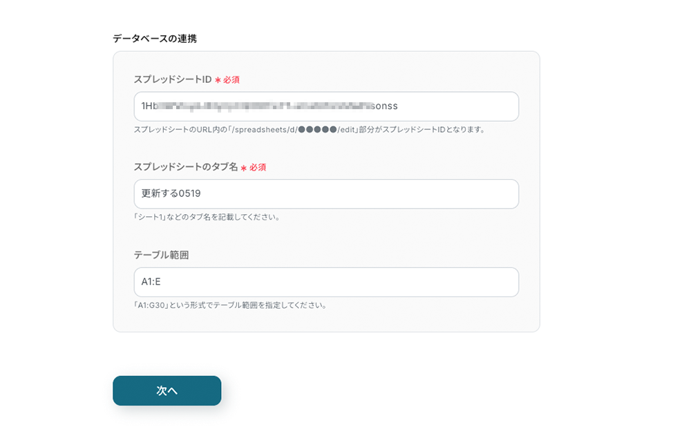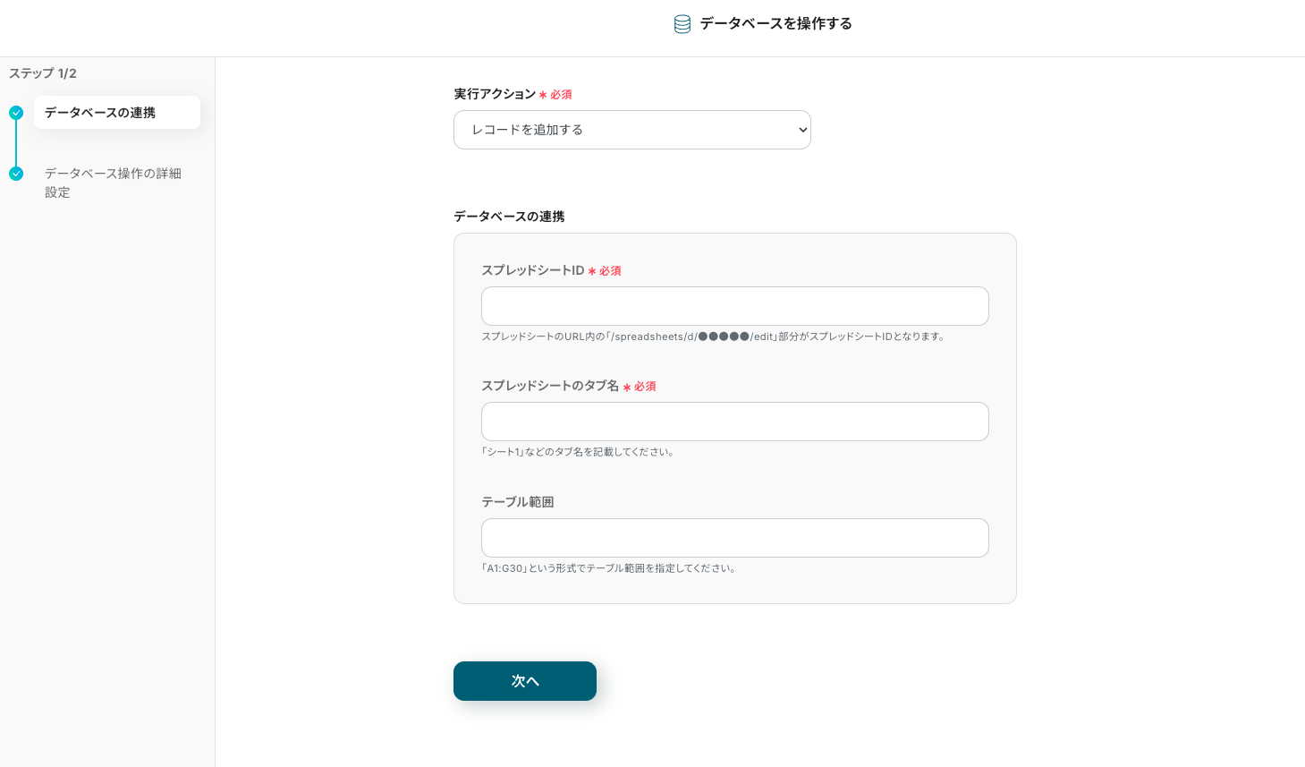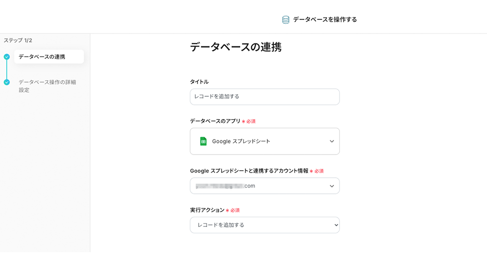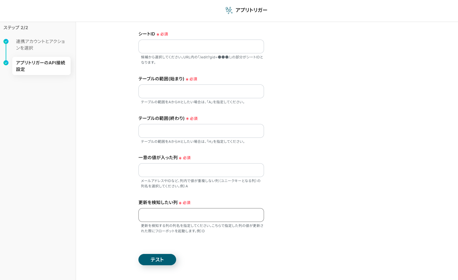 以下は、前の工程で連携したシートと同じ内容を入力します。こちらでも、フィールドをクリックして候補から選択可能です。