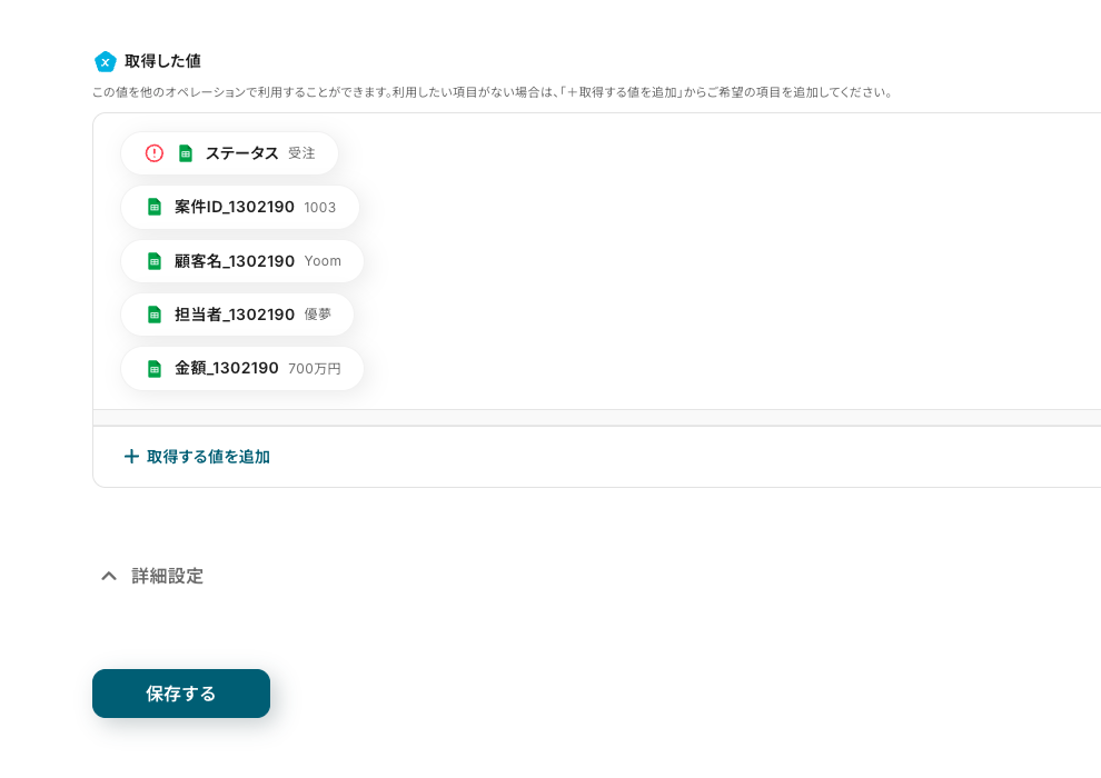 - こちらは、前の工程で取得した値から項目を選択します。コピーする表に【ステータス】は不要のため、それ以外の全て(案件・顧客名・担当者・金額)を設定します。