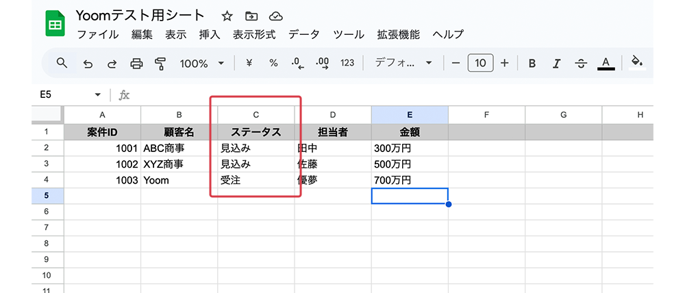 サンプルシートの場合は、ステータスが【受注】になった行を検知したいので、以下のように設定します。
