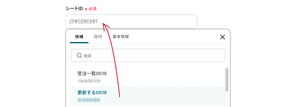 - 編集欄をクリックすると、プルダウンメニューが表示され、連携したアカウントに権限があるシートが候補として表示されます。選択すると、IDを引用できます。