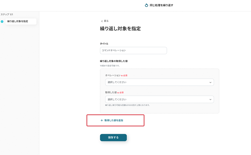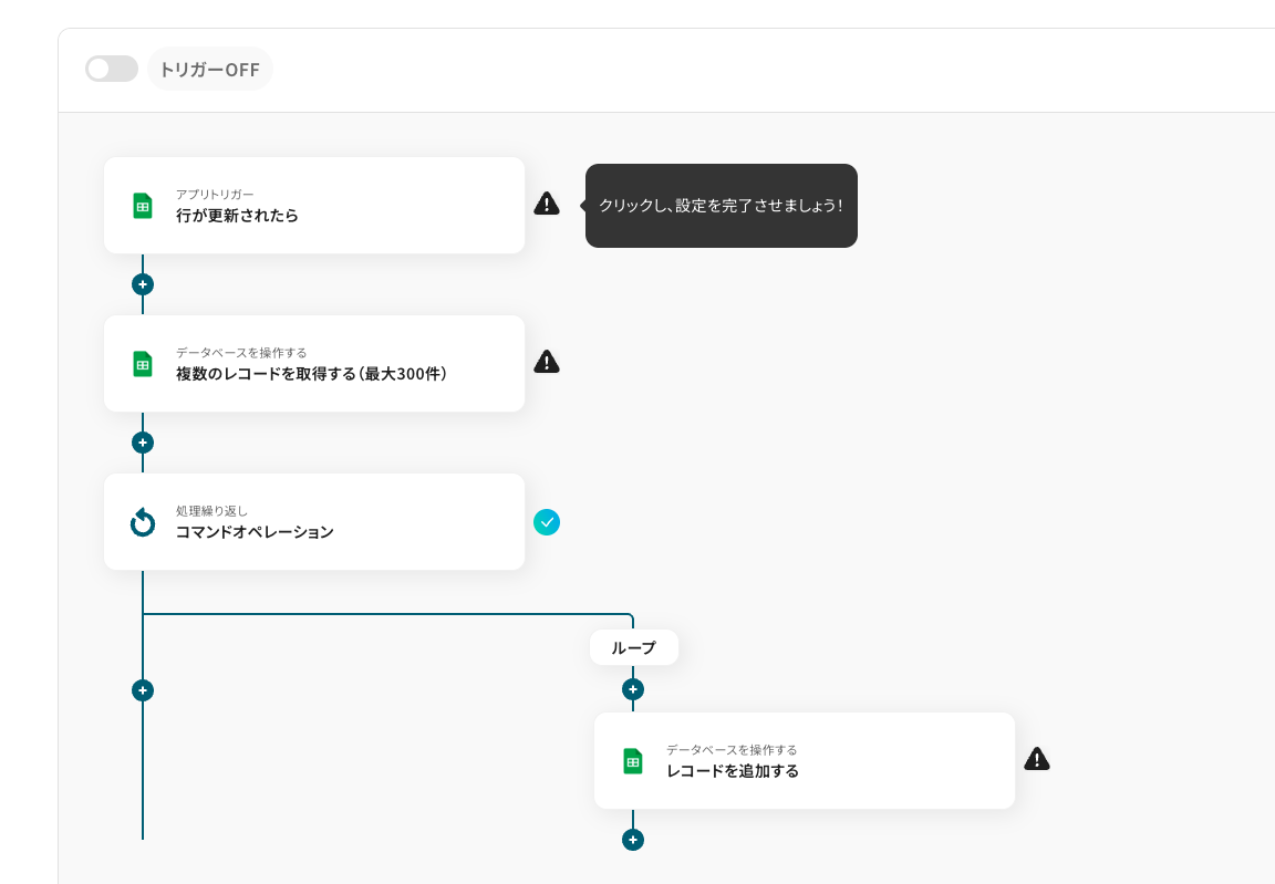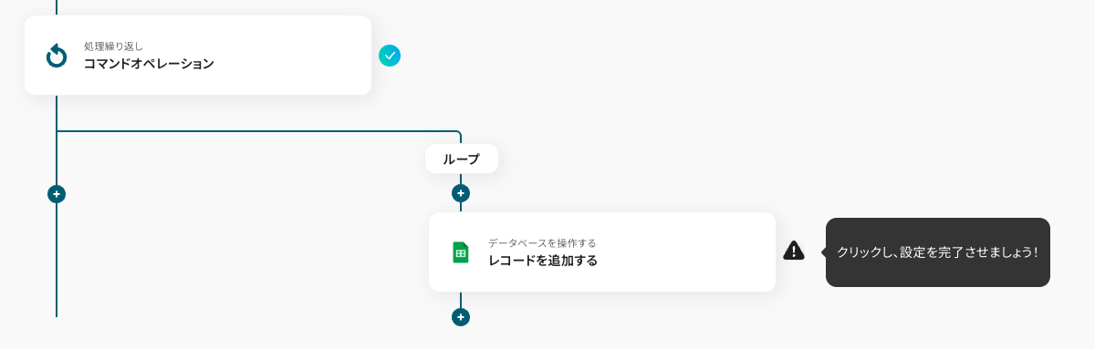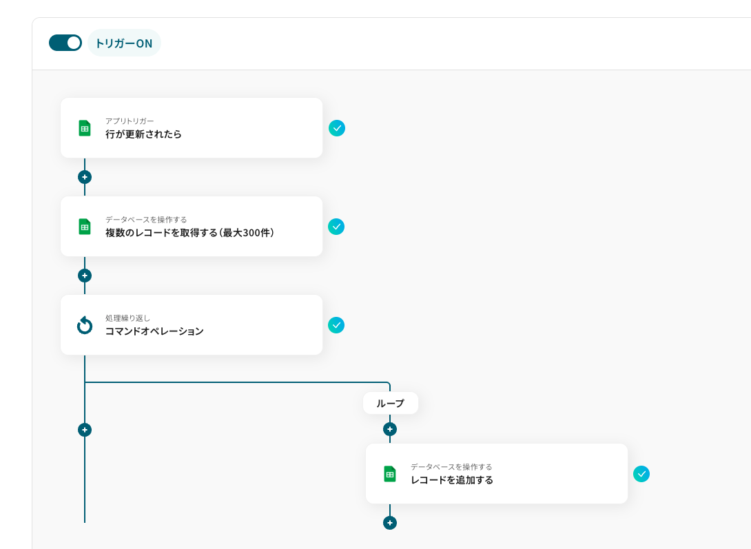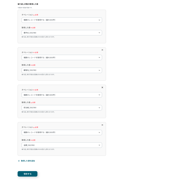 これらをまとめて処理することは難しいため、「繰り返し」機能を使って、レコードを一件ずつ処理する設定です。