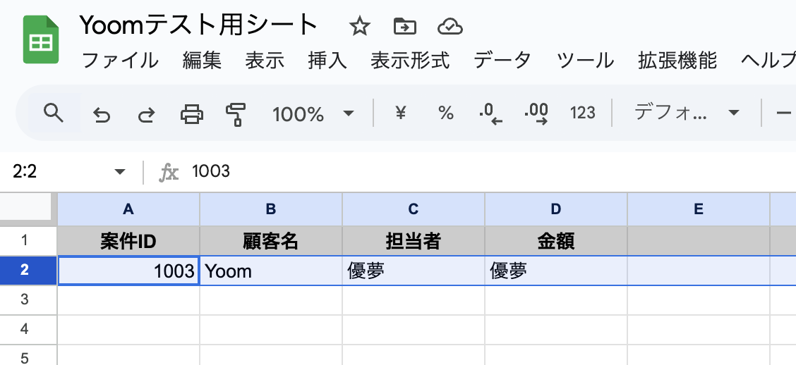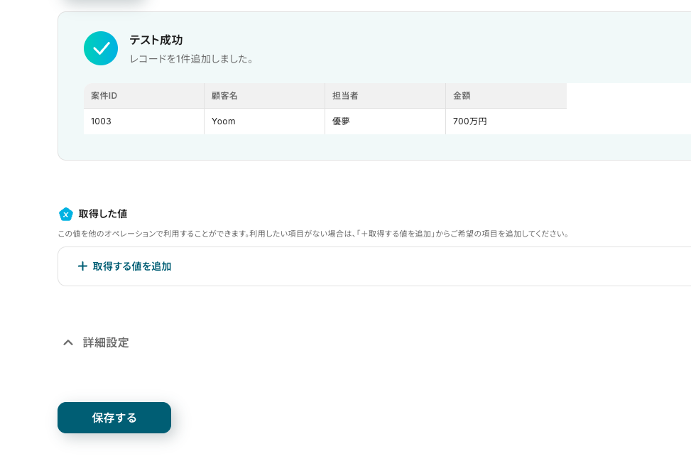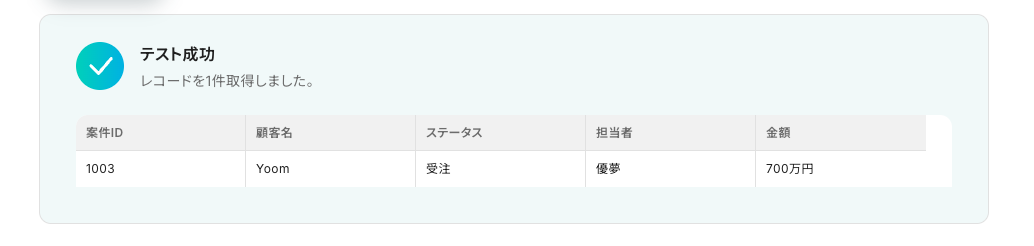 この画面は、YoomとGoogle スプレッドシートが正常に連携し、情報を取得できたことを示しています。