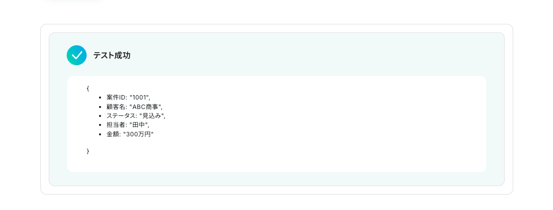 成功すると受注に該当する行が検出され、項目ごとに値が取得できたことも確認できます。最大300件情報を取得できます。
