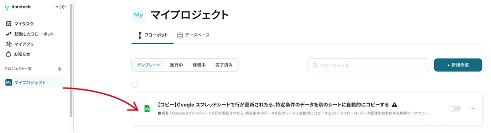 コピーしたテンプレートは、マイプロジェクトに追加されます。マイプロジェクトは左のメニューバーからアクセス可能です。