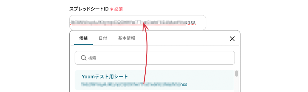- フィールドをクリックするとプルダウンメニューが表示されます。連携済みのアカウントにある既存シートが表示されるので、連携するシートを選択します。選択すると、IDが引用されます。