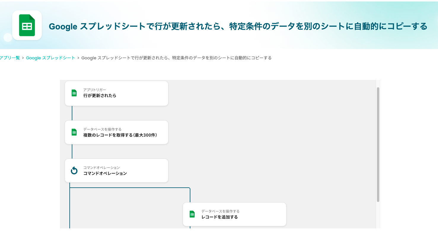 「Googleスプレッドシートで行が更新されたら、特定条件のデータを別のシートに自動的にコピーする」ワークフローは、データ管理を効率化する業務ワークフローです。