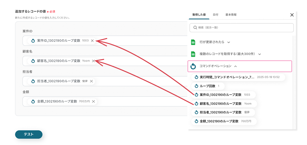 全ての枠に、値の紐付けができたらテストボタンをクリックします。