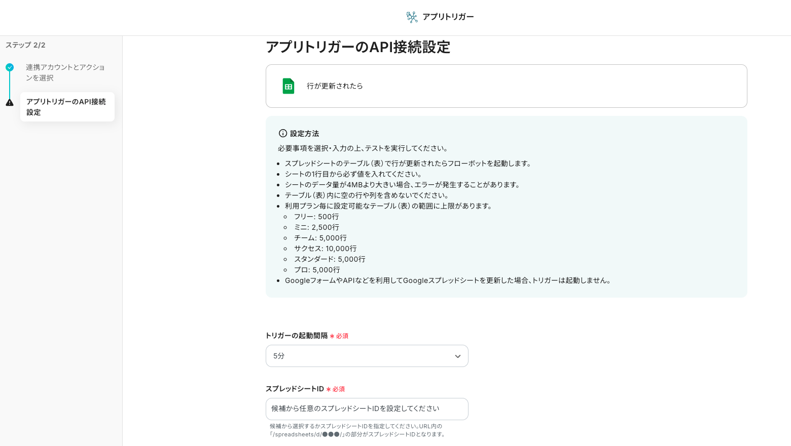 テンプレートの1つ目の工程をクリックし、フローボットのトリガー(起点)を設定します。この工程では、Google スプレッドシートを指定し、検知する条件を設定します。