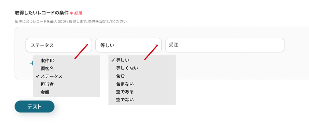 【ステータス】が、【受注】と【等しい】が条件になりました。設定を確認できたら、テストボタンをクリックします。
