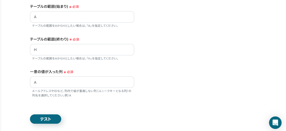 テーブルの範囲(始まり)・(終わり)・一意の値が入った列(メールアドレスなど、値が重複しないもの )は下記画像の通り設定されています。 枠外の注釈を参考に、作成したGoogle スプレッドシートに合わせて変更しましょう!