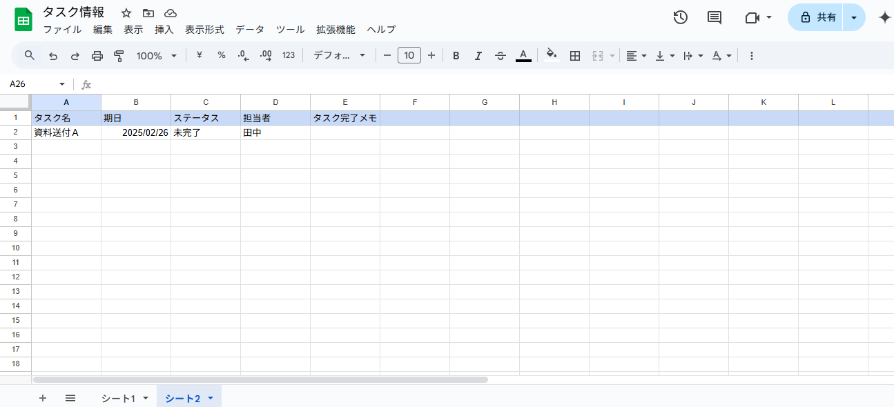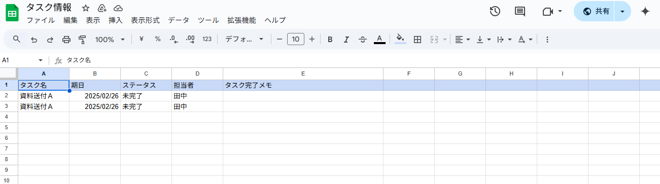 マイアプリ連携前に、テンプレートで使用するGoogle スプレッドシートを作成しておきましょう。今回は下記画面のようなタスク情報をまとめるシートを準備しました! (マイアプリ連携後に作成した場合、うまく連携できないことがありますご注意ください。)