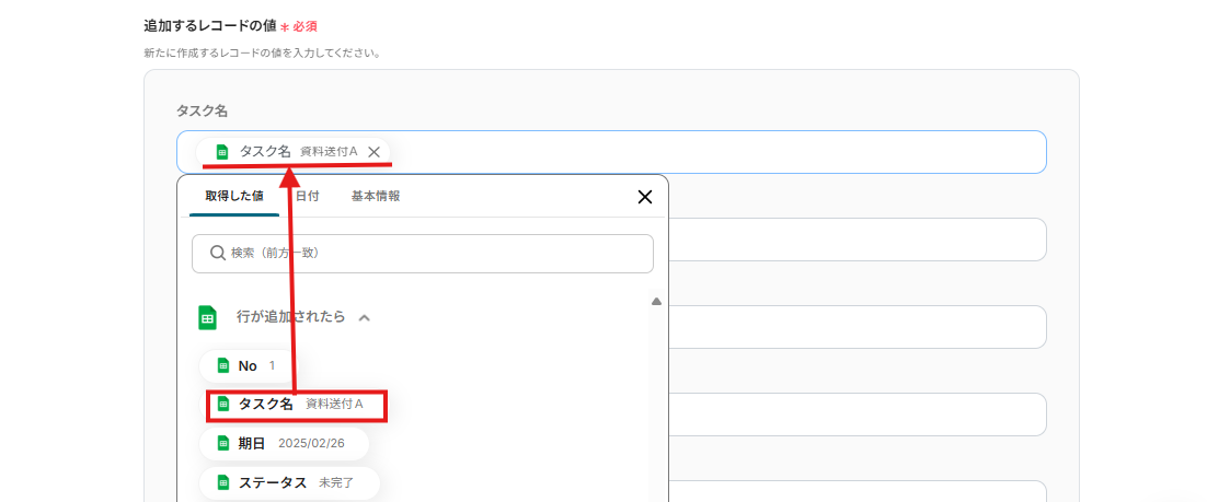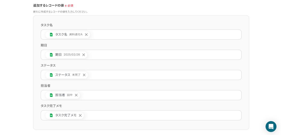 追加するレコードの値は、下記画面のように設定していきましょう! このように設定することで、トリガーで設定したGoogle スプレッドシートにデータが追加されたら、先ほど設定したGoogle スプレッドシートのシートにデータを自動で引用することができますよ。