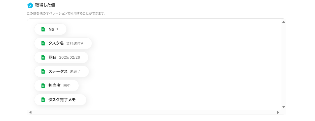 テストが成功すると、下記画面の通りGoogle スプレッドシートに登録した情報が値として取得されます。 ここで取得された値は、次に行うアクションの設定で使用するので、正しく取得できているか確認後、設定を保存しましょう。