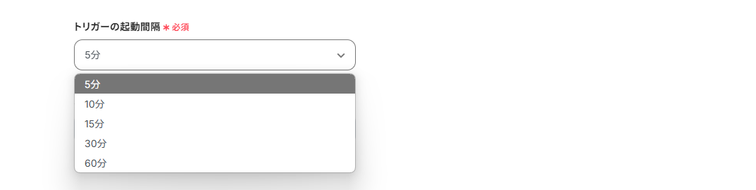 トリガーの起動タイミングは、5分、10分、15分、30分、60分のいずれかで設定できます。 ご利用プラン によって、設定できるトリガーの最短間隔が違うので、その点は要チェックです。 なお、基本的にはそのプランの最短の起動間隔にしてお使いいただくことをおすすめします。
