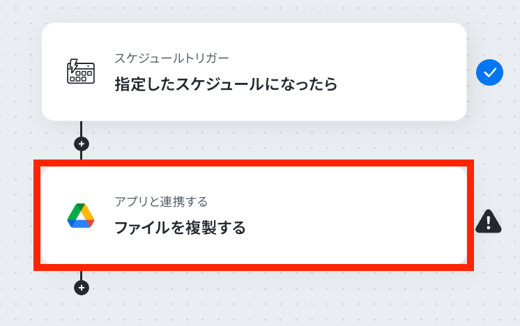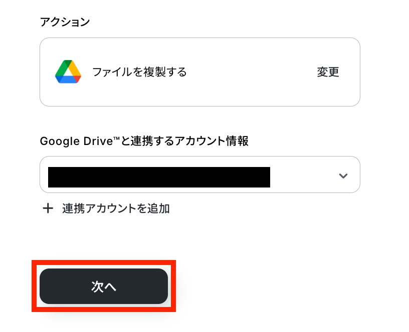ステップ4:Google Driveのアクション設定 ファイルを複製する設定を行います。2つ目の赤枠をクリックしましょう!
