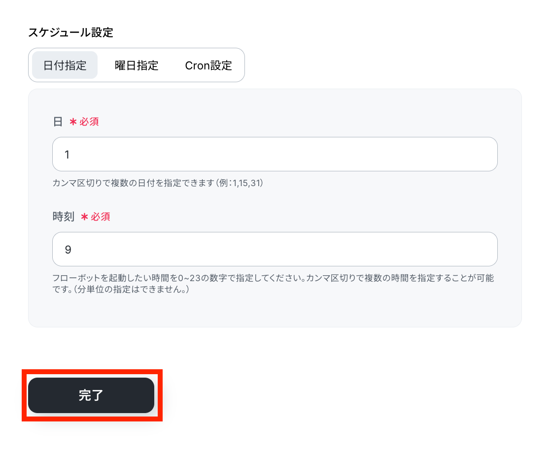 希望のスケジュールが設定できたら、「完了」ボタンを押しておきましょう。