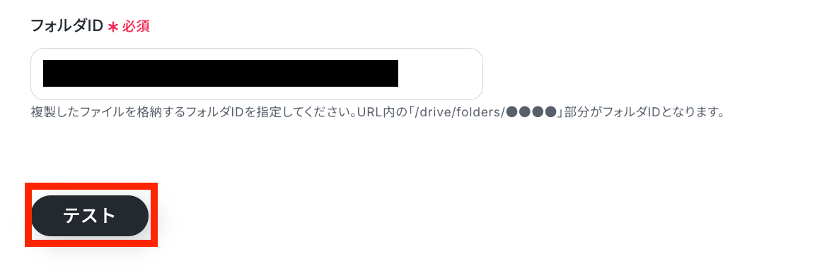 Google Driveでファイル一覧を取得するアクションで、対象としたいフォルダのIDを任意で設定してください。 繰り返し処理の中でGoogle Driveからファイルをダウンロードする際に、ファイルIDを動的に指定してください。 Dropboxにファイルをアップロードするアクションで、格納先のフォルダパスやファイル名、ファイルの添付方法を任意で設定してください。 ■注意事項