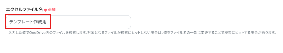 「エクセルファイル名」は、事前に作成したMicrosoft Excelファイルのファイル名を入力してください。