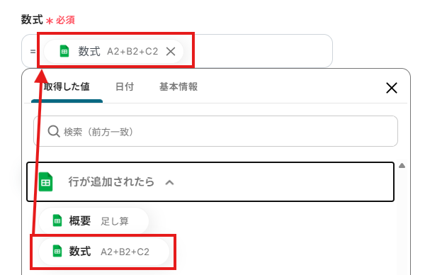 「数式」は、入力欄をクリックして表示されるアウトプット(取得した値)から選択してください。