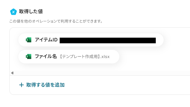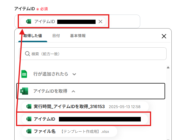 「アイテムID」は、入力欄をクリックして表示されるアウトプット(取得した値)から選択してください。