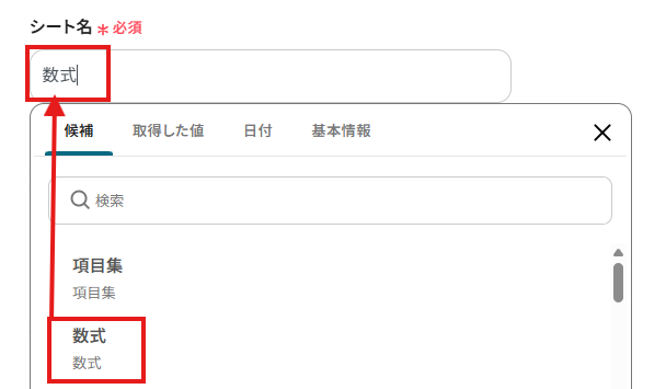 「シート名」は、入力欄をクリックして表示される候補から選択できます。