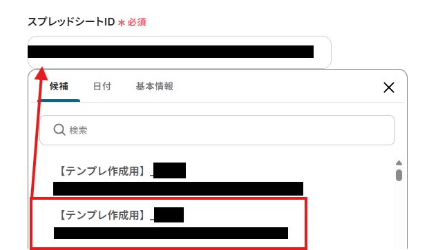 4.「スプレッドシートID」「シートID」は、入力欄をクリックして表示される候補から選択してください。