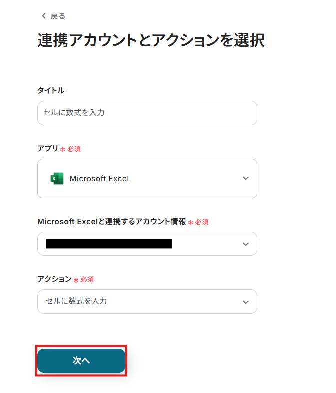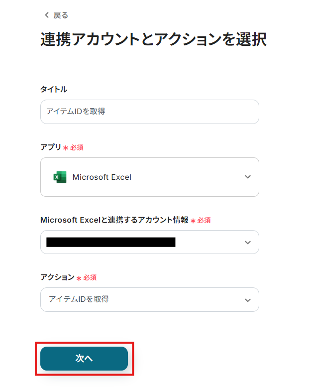 連携するアカウント情報には、ステップ1で連携したアカウント情報が反映されています。トリガーアクションはそのままにして、「次へ」をクリックしてください。