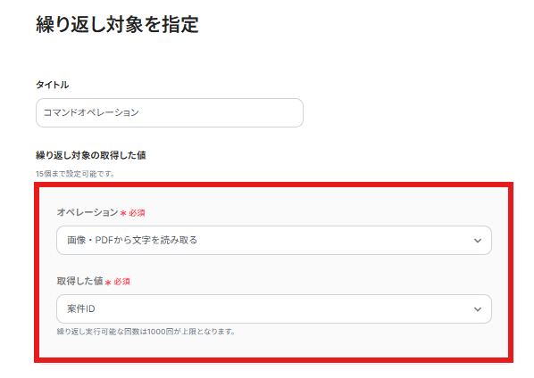繰り返し対象を指定する設定の画面が表示されます。フォームで送信されたPDFや画像から、取得したい内容を設定していきましょう。