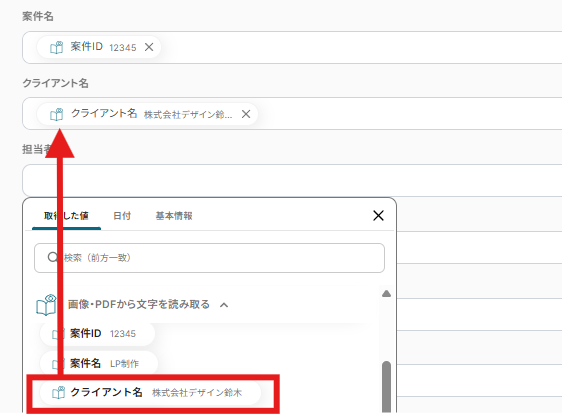 追加するレコードの値の箇所には、以下のようにPDFから取得した値を入力していきましょう。