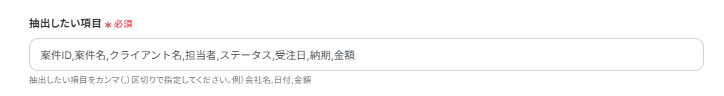 抽出したい項目には、PDFから取得したい項目をカンマで区切り入力しましょう。